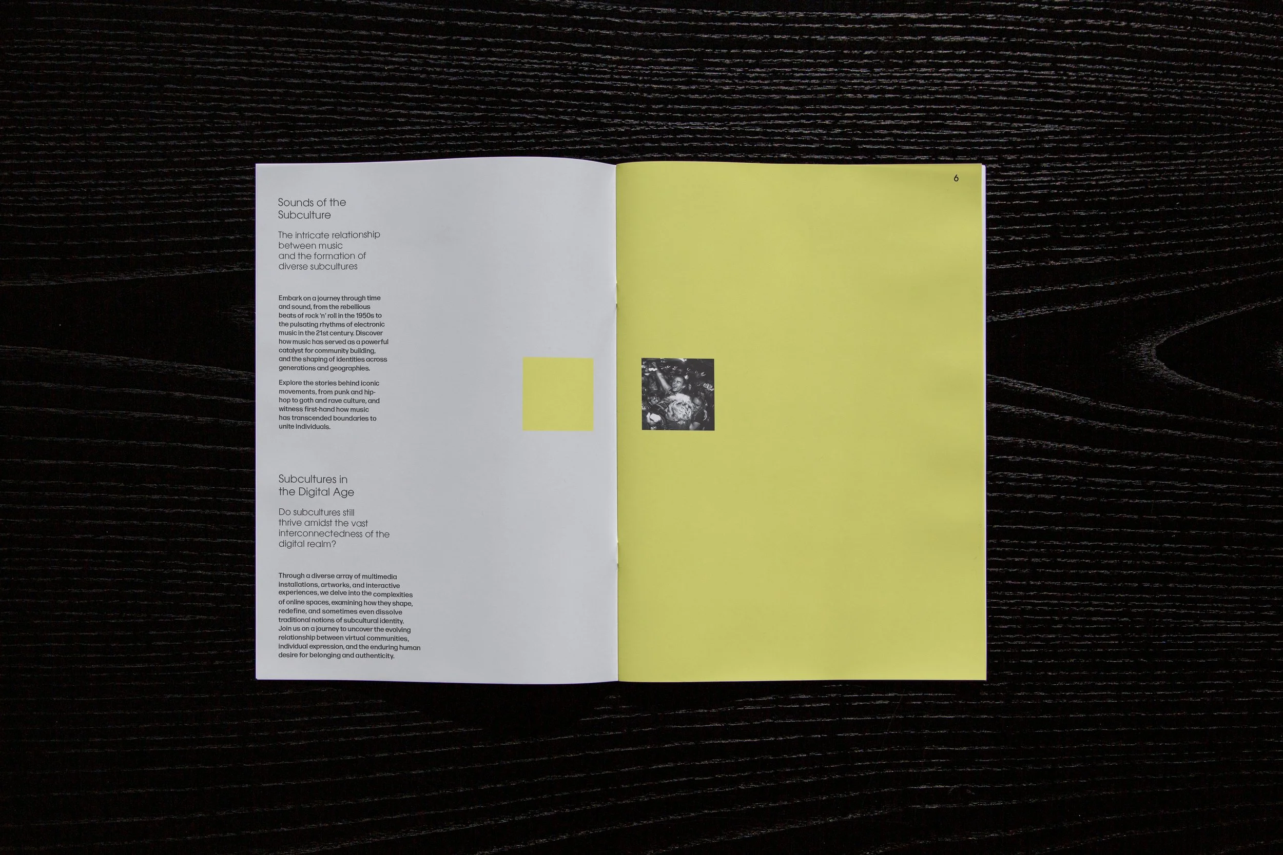 This brochure for a “Counter Culture” museum exhibit explores the idea of rebellion through tension. The design serves to create a feeling of resistance and draws the eye from one focal point to another.